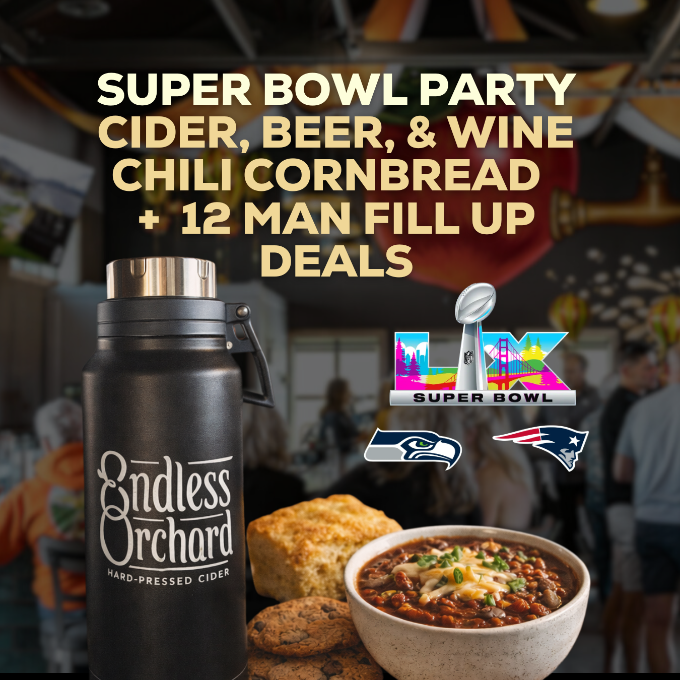 Super Bowl Sunday at Endless OrchardDate: Sunday, February 8thTime: Starting 3:30 PM Join us at Endless Orchard for Super Bowl Sunday and cheer on the Seahawks with great cider, food, and fun! Enjoy our 12-Man Fill Up featuring chili, cornbread, and a cookie for $15. Pair it with a Game Day Growler — $12 off...